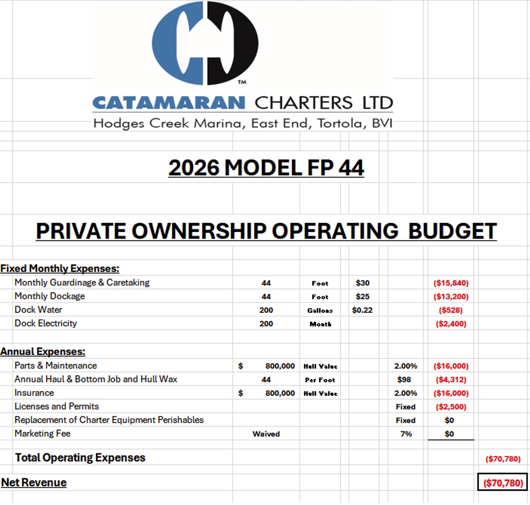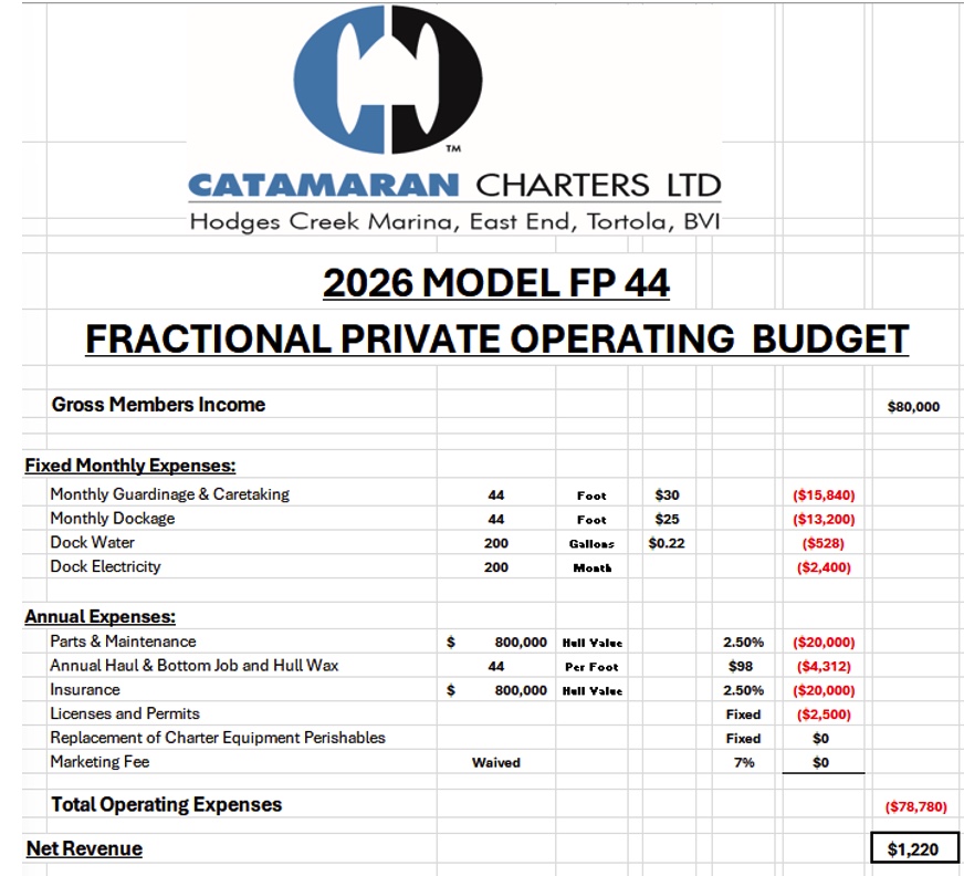Upfront Cost: This will totally depend on the number of Owners buying a share in the vessel but in general if you purchase your yacht with 4 partners then your 1/5th share in a 44-foot $950,000 catamaran in the Caribbean operating in a Fractional Ownership Program with full Charter Management will cost around $165,000. Operating Costs: In general, chartering the vessel in a full-time program should probably breakeven after covering the costs of owning, operating, and maintaining the vessel over a 5-year period with fewer weeks available for paid charters because of the personal usage of the 5 owners. This in turn will limit the amount of time each owner can use the boat. Vessel Resale: Upon the resale of your boat, the depreciation of your boat will be like that of a charter vessel due to the same factors. Depreciation will therefore more likely be around 50% on a charter boat averaged over 5 years, which is around $85,000 per year including the cost of selling your boat at the end of your usage. However, this annual depreciation cost will be shared between 5-7 owners. Tax Advantages: This plan may qualify for tax advantages but as an Owner is only liable for 1/5th of the profits, losses or depreciation, the tax advantages open to an Owner are also proportional and generally do not tend to be significant. Again, your tax advisor should advise you on this. Summary: Fractional Charter Ownership will therefore cost an owner approximately. -$15,000 annually while still giving pride of ownership, even though you own a rental asset. | |