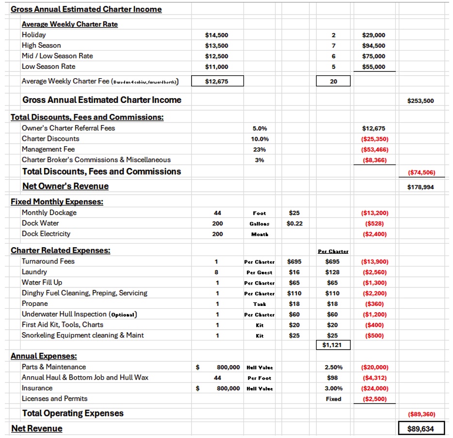 Upfront Cost: As with Private Ownership, the upfront cost will be the same if you want to own a 44-foot catamaran in the Caribbean in a Charter Management Program, around $950,000. Operating Costs: In general, chartering the vessel in a full-time program, assuming the vessel has no mortgage, should, at a very minimum, cover the entire costs of owning, operating, chartering, and maintaining the vessel and generate an average annual return of around +$50,000 over a 5-year period. Returns will be higher in the earlier years and decrease as the vessel ages. Vessel Resale: If operated in full-time charter, the depreciation of your boat will be greater than that of a privately-owned vessel due to 2 major factors. Privately-owned vessels tend to have significantly less wear and tear on them due to much less use and in addition they are generally a 3-cabin layout which is much more appealing to a future brokerage buyer who is generally not looking to charter the boat and prefers to have a much bigger cabin for himself. Depreciation will therefore be around 50% on a charter boat averaged over 5 years, which is around -$85,000 per year. Tax Advantages: As previously stated there can be tax benefits by writing off your depreciation but always remember that this will also mean you will also have to pay tax on the income the vessel generates. Summary: Charter Management will therefore cost you approximately -$35,000 annually but will still give you the benefits of ownership while giving up certain privileges including the loss of privacy which comes with owning a rental asset. | |